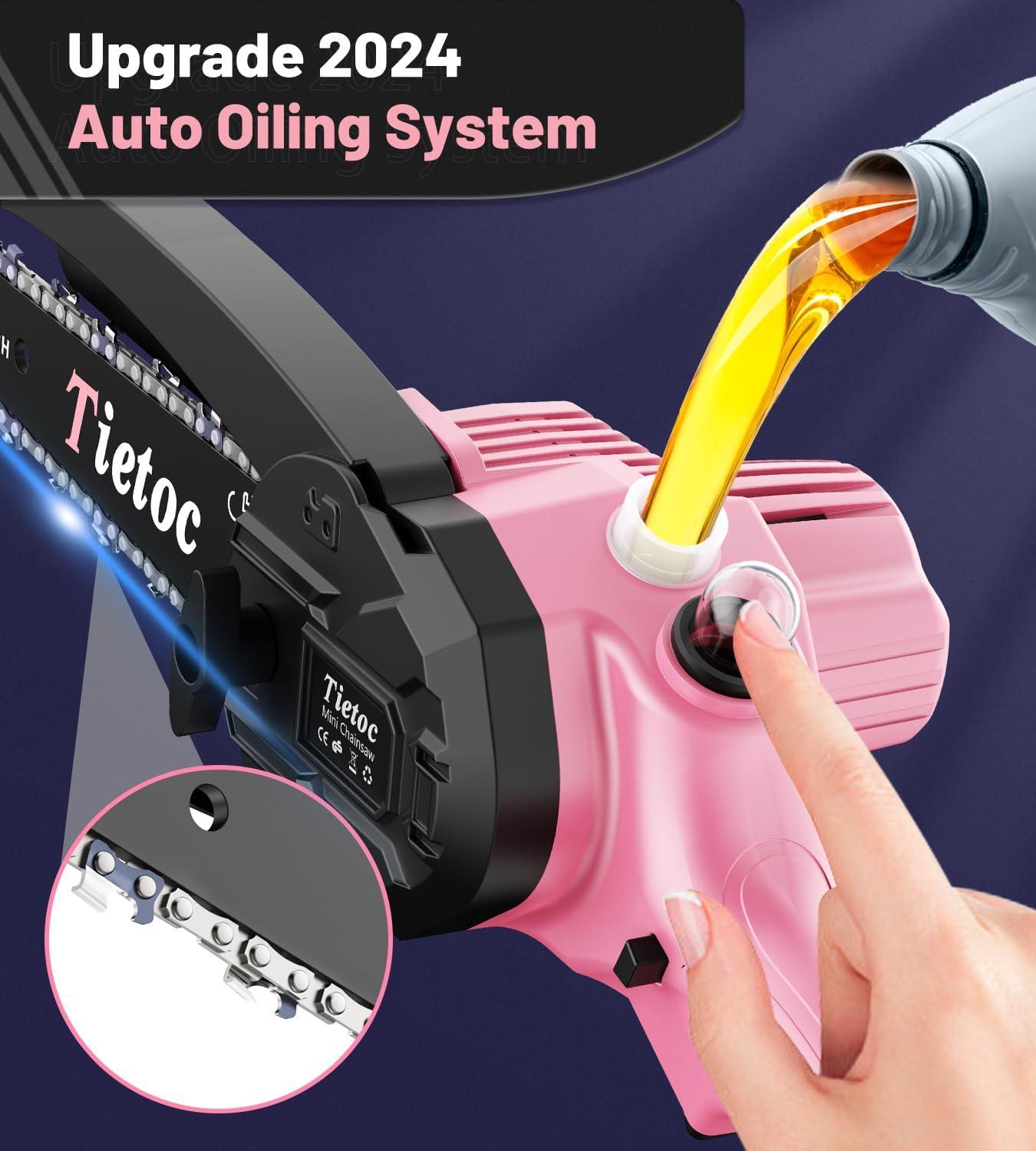 THE AUTOMATIC OILER IS A GAME CHANGER: The saw has a reservoir for chain oil which is great. (Some Other Mini Chainsaws Do Not Have That!) “Automatic” oiling isn't self oiling like a larger saw, but a bulb you push to feed oil to the bar and chain. All of these mini saw blades require lubrication to work at their best so you should press the lubrication button fairly often while cutting. (Universal Saw Chain Oil for Fast Efficient Cutting Is Recommended.)